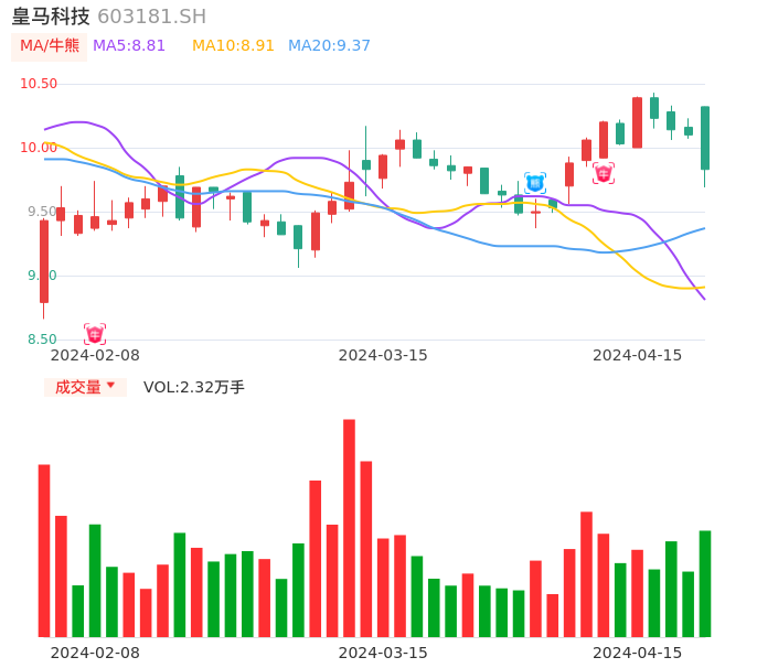 04月15日,皇马科技收报9.83,股价涨幅-2.67%,成交金额2309.94万元,换手率0.39%。