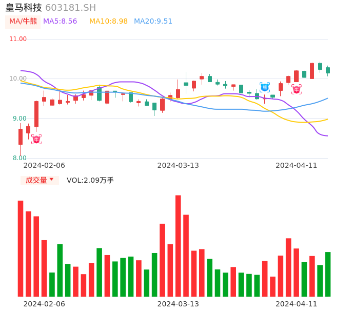 04月11日,皇马科技收报10.14,股价涨幅-0.88%,成交金额2128.69万元,换手率0.35%。
