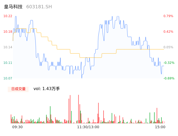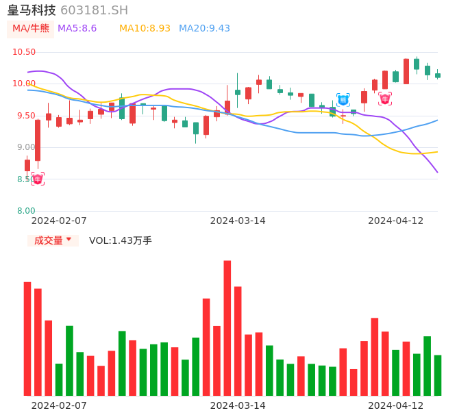 04月12日,皇马科技收报10.10,股价涨幅-0.39%,成交金额1448.55万元,换手率0.24%。