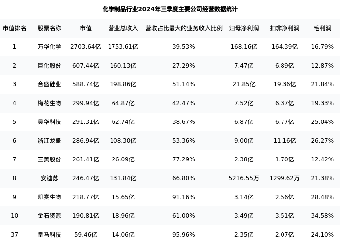 皇马科技最新报告期数据为三季度,下表汇总了化学制品行业内市值靠前的公司三季度主要经营数据