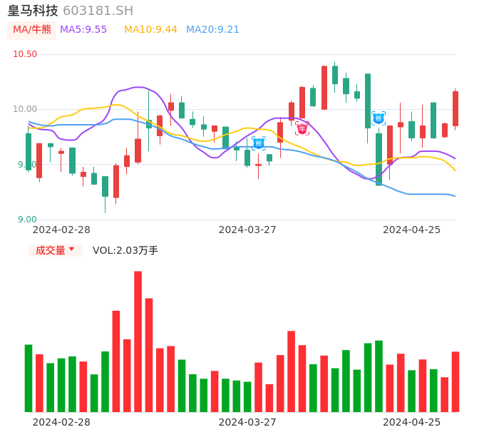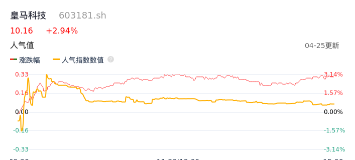 04月25日,皇马科技收报10.16,股价涨幅2.94%,成交金额2054.59万元,换手率0.35%。