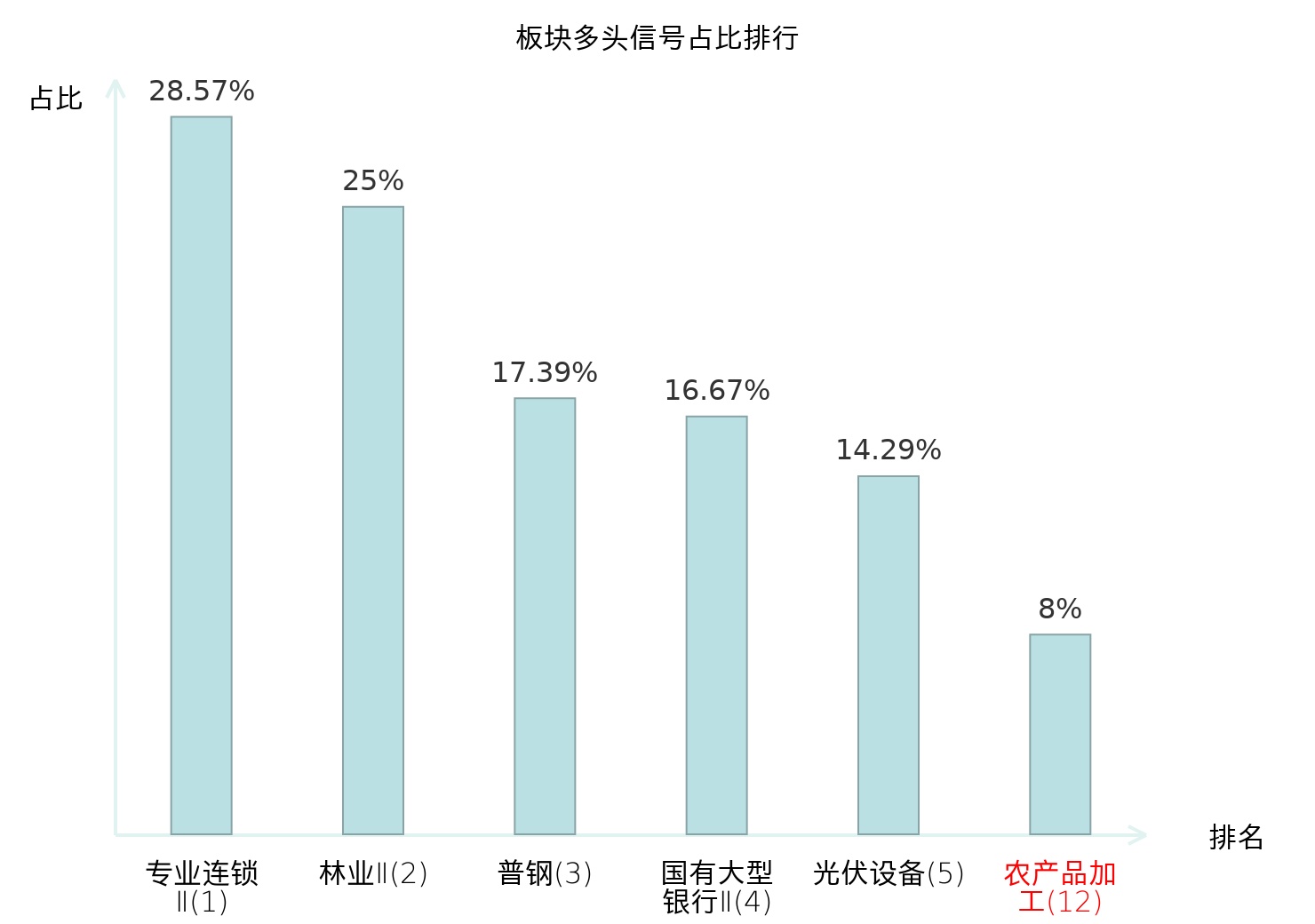 全市场所有行业板块中主力多头信号占比排名中,专业连锁Ⅱ板块位居第一。专业连锁Ⅱ板块名次提升最快,较昨日上升122位。