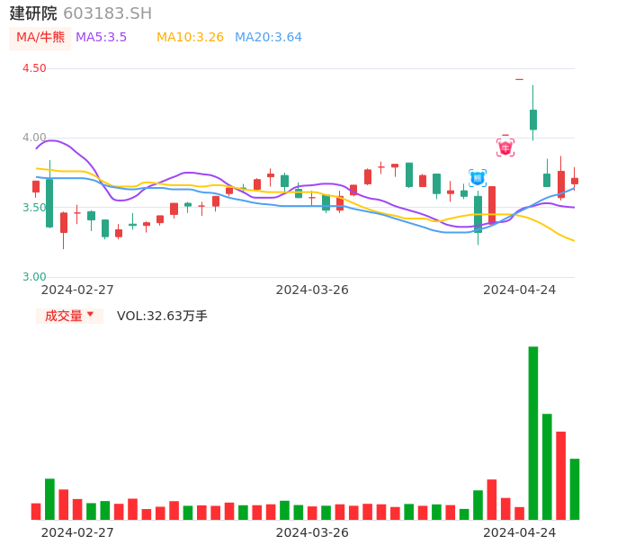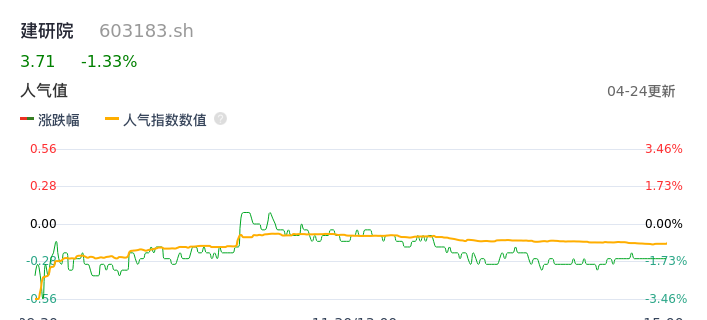 04月24日,建研院收报3.71,股价涨幅-1.33%,成交金额1.21亿元,换手率6.51%。