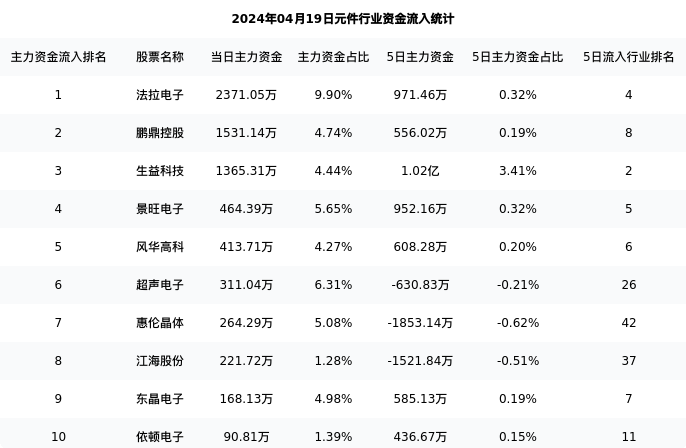 从主力资金流向来看,元件行业今日主力资金流入26.35亿元,在所有申万二级行业中排名:5/131。