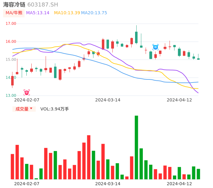 04月12日,海容冷链收报15.00,股价涨幅-0.40%,成交金额5975.74万元,换手率1.03%。