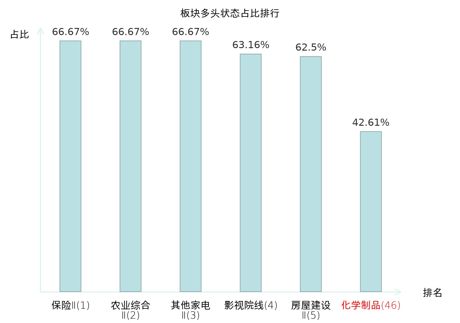 全市场所有行业板块中主力多头状态占比排名中,保险Ⅱ板块位居第一。渔业板块名次提升最快,较昨日上升103位。