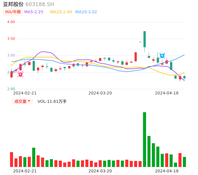 04月18日,亚邦股份收报2.32,股价涨幅-2.52%,成交金额2687.79万元,换手率2.04%。