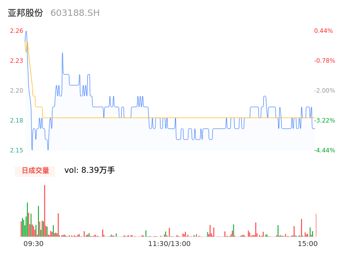 04月22日,亚邦股份收报2.17,股价涨幅-3.56%,成交金额1829.54万元,换手率1.47%。