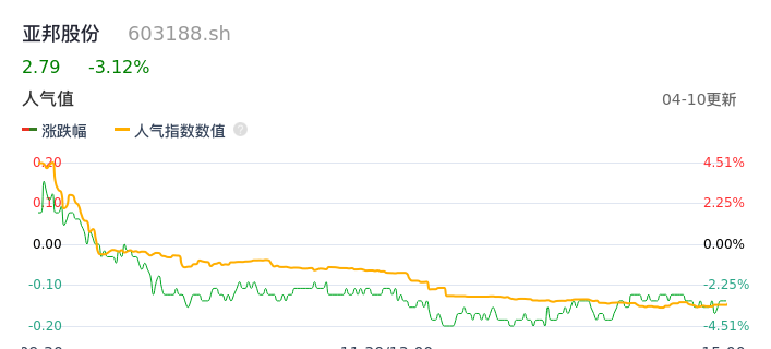 04月10日,亚邦股份收报2.79,股价涨幅-3.12%,成交金额6773.59万元,换手率4.15%。