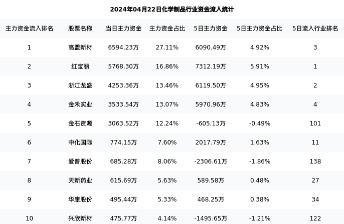 从主力资金流向来看,化学制品行业今日主力资金流入36.65亿元,在所有申万二级行业中排名:120/131。