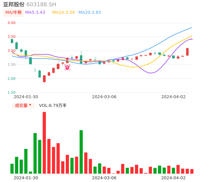 04月02日,亚邦股份收报3.40,股价涨幅10.03%,成交金额2309.31万元,换手率1.19%。