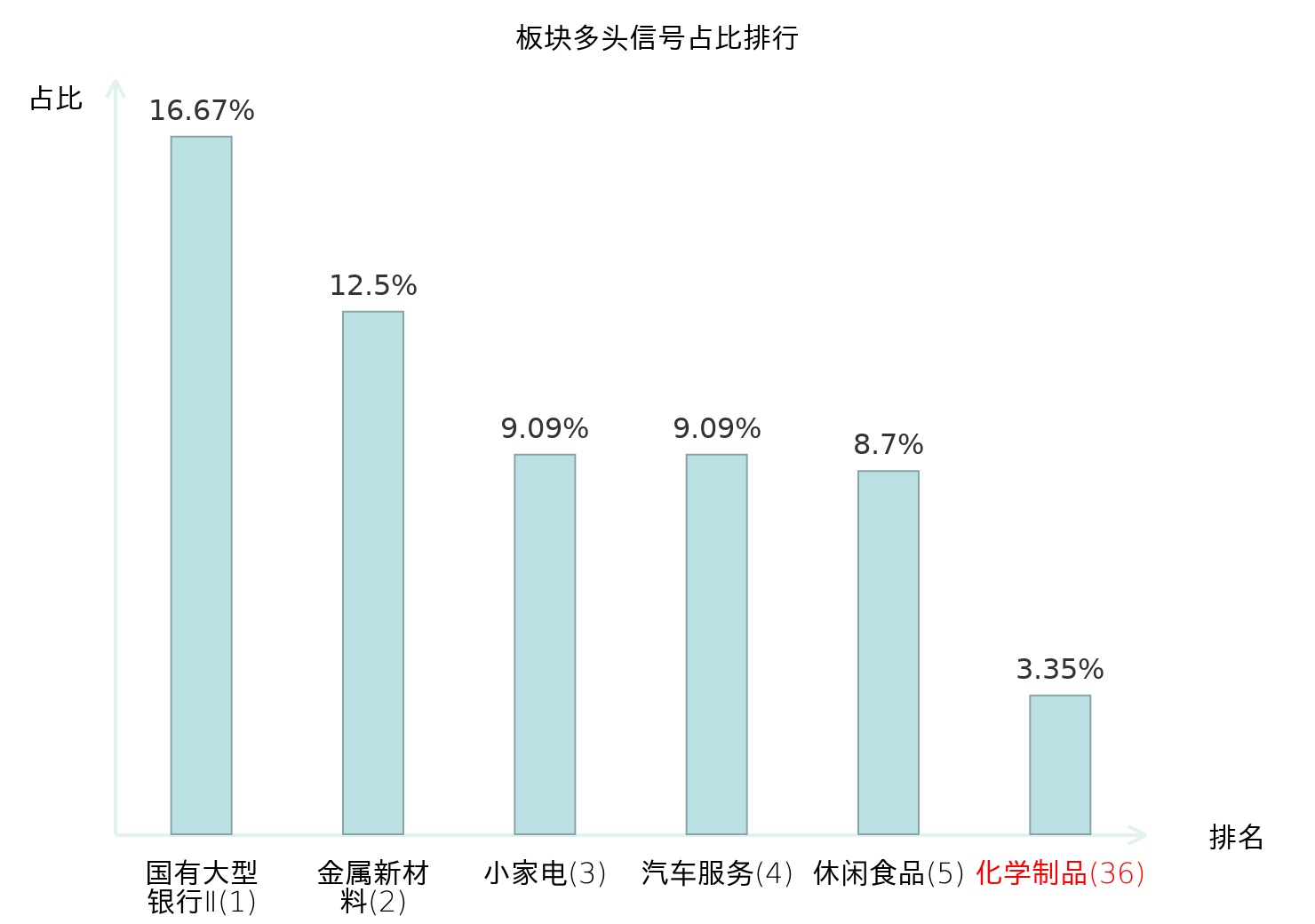 全市场所有行业板块中主力多头信号占比排名中,国有大型银行Ⅱ板块位居第一。汽车服务板块名次提升最快,较昨日上升109位。