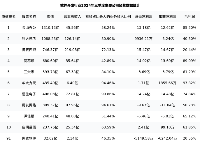 网达软件最新报告期数据为三季度,下表汇总了软件开发行业内市值靠前的公司三季度主要经营数据
