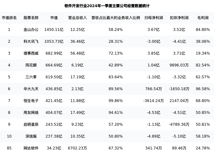 网达软件最新报告期数据为一季度,下表汇总了软件开发行业内市值靠前的公司一季度主要经营数据