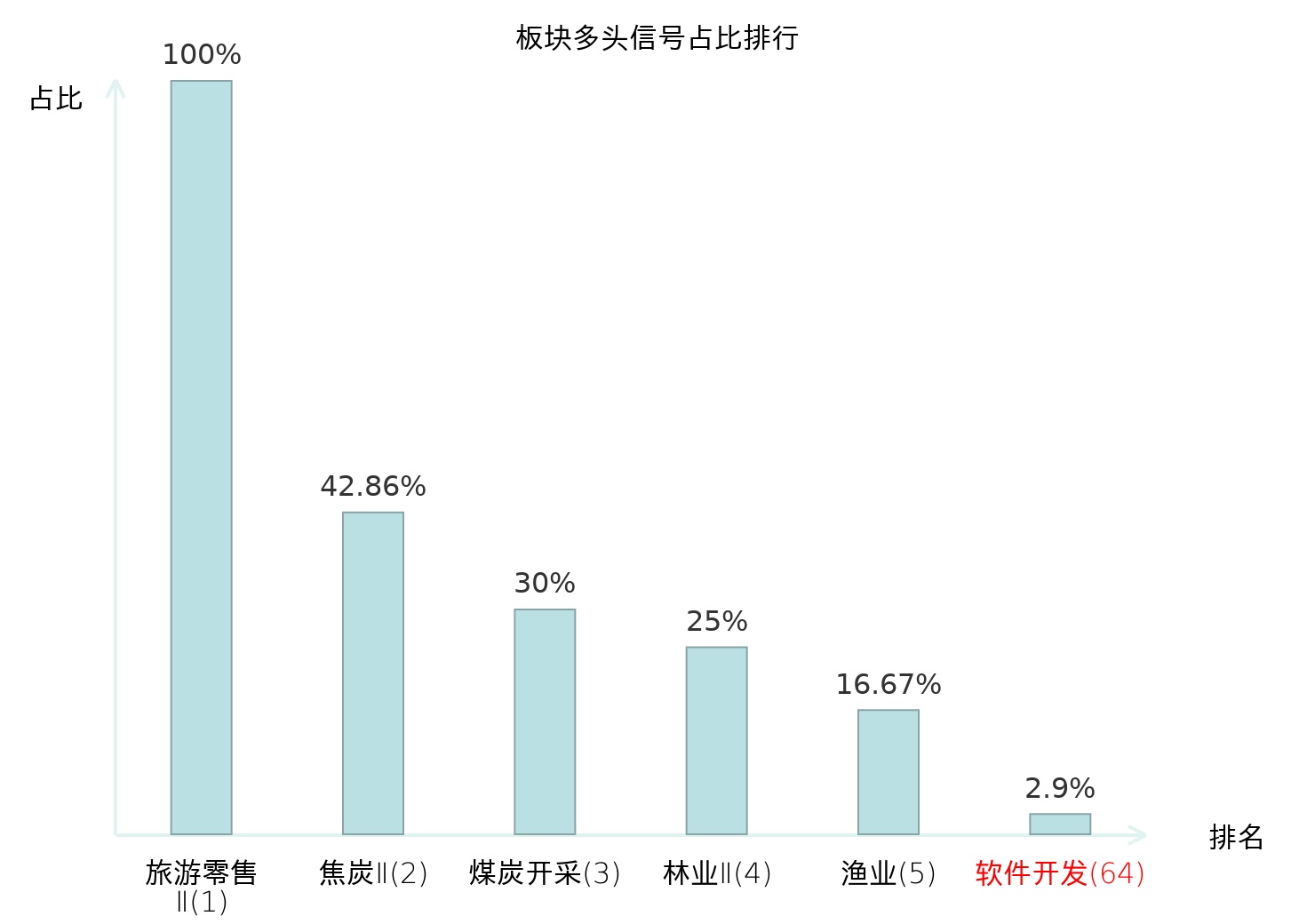 全市场所有行业板块中主力多头信号占比排名中,旅游零售Ⅱ板块位居第一。旅游零售Ⅱ板块名次提升最快,较昨日上升130位。