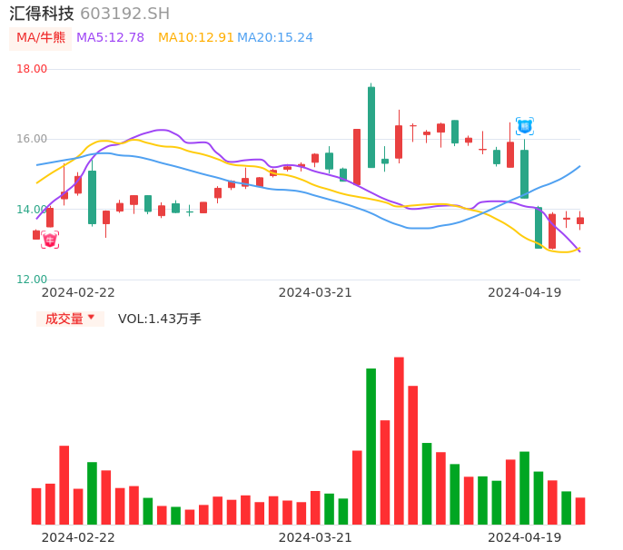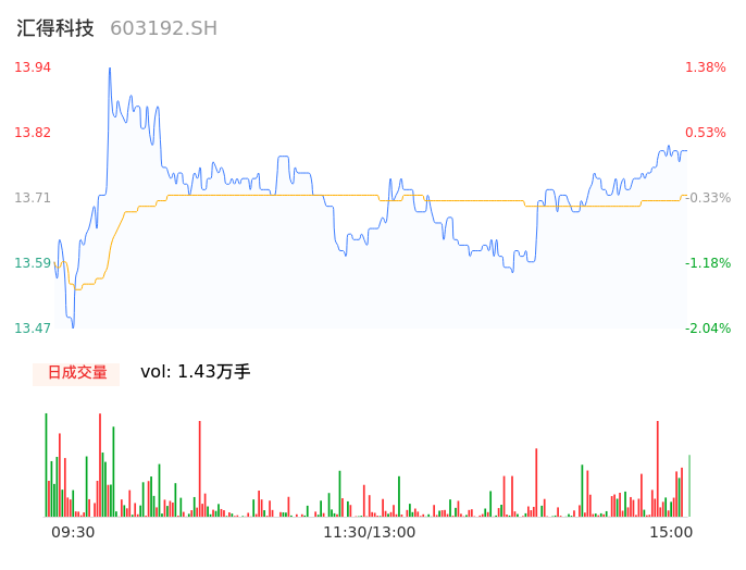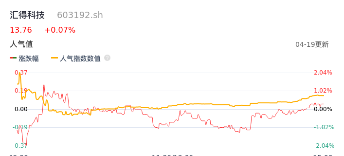 04月19日,汇得科技收报13.76,股价涨幅0.07%,成交金额1956.37万元,换手率1.03%。