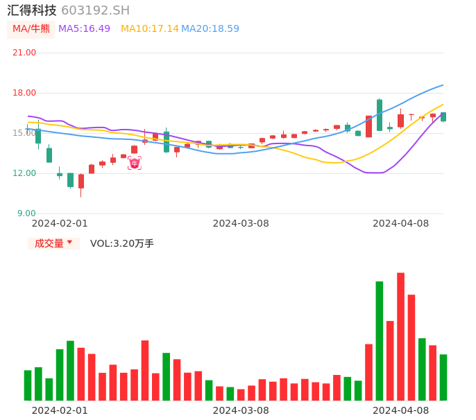 04月08日,汇得科技收报15.89,股价涨幅-3.29%,成交金额5170.70万元,换手率2.31%。