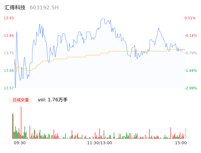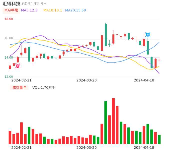 04月18日,汇得科技收报13.75,股价涨幅-0.79%,成交金额2419.96万元,换手率1.27%。