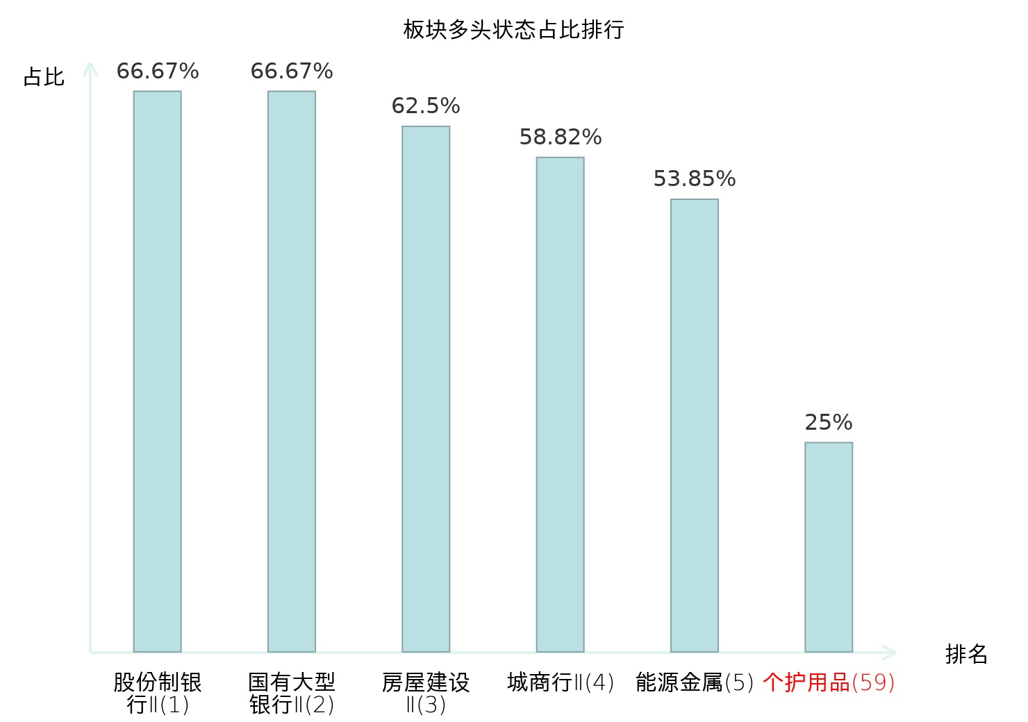 全市场所有行业板块中主力多头状态占比排名中,股份制银行Ⅱ板块位居第一。航空机场板块名次提升最快,较昨日上升68位。