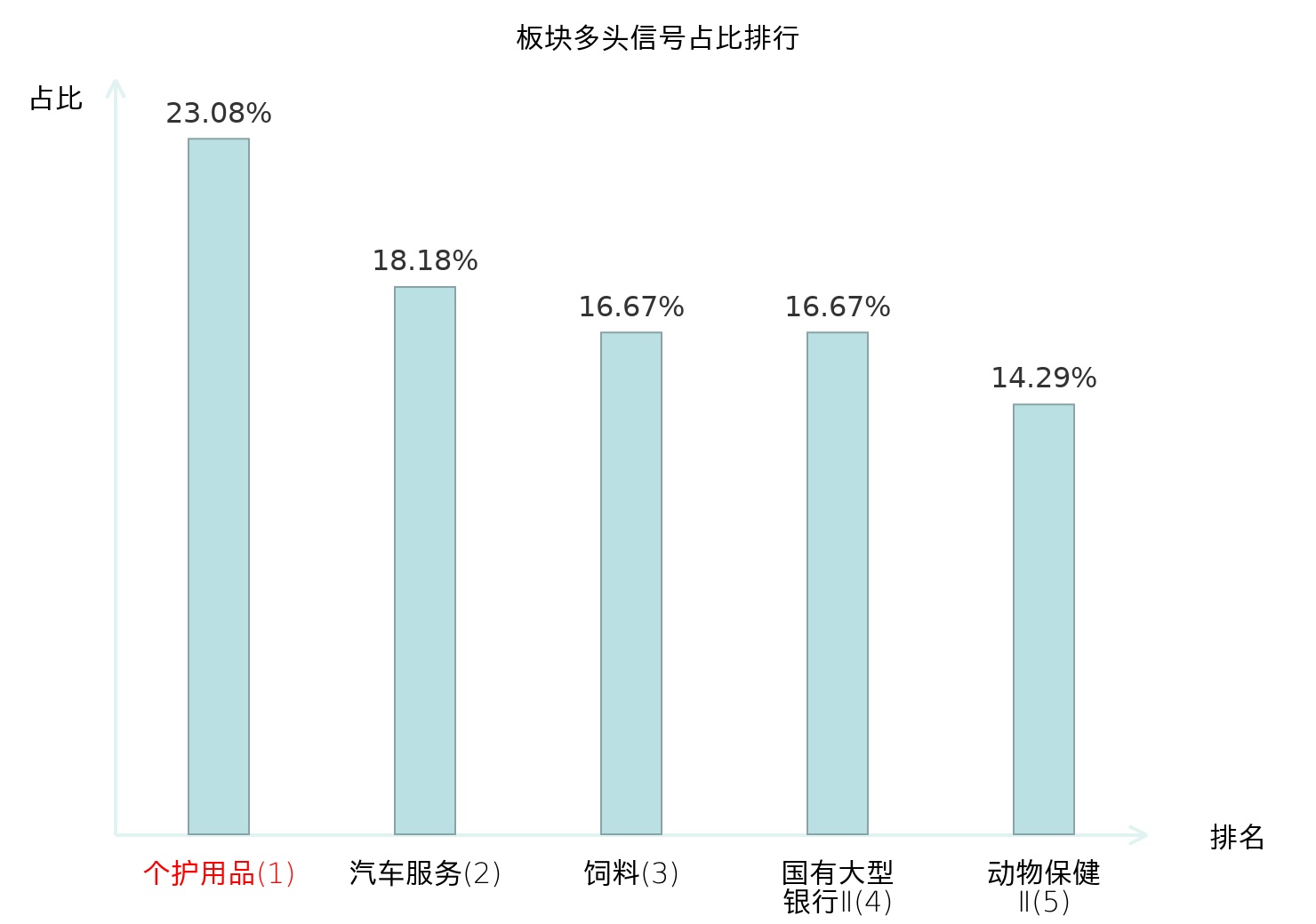 全市场所有行业板块中主力多头信号占比排名中,个护用品板块位居第一。国有大型银行Ⅱ板块名次提升最快,较昨日上升119位。