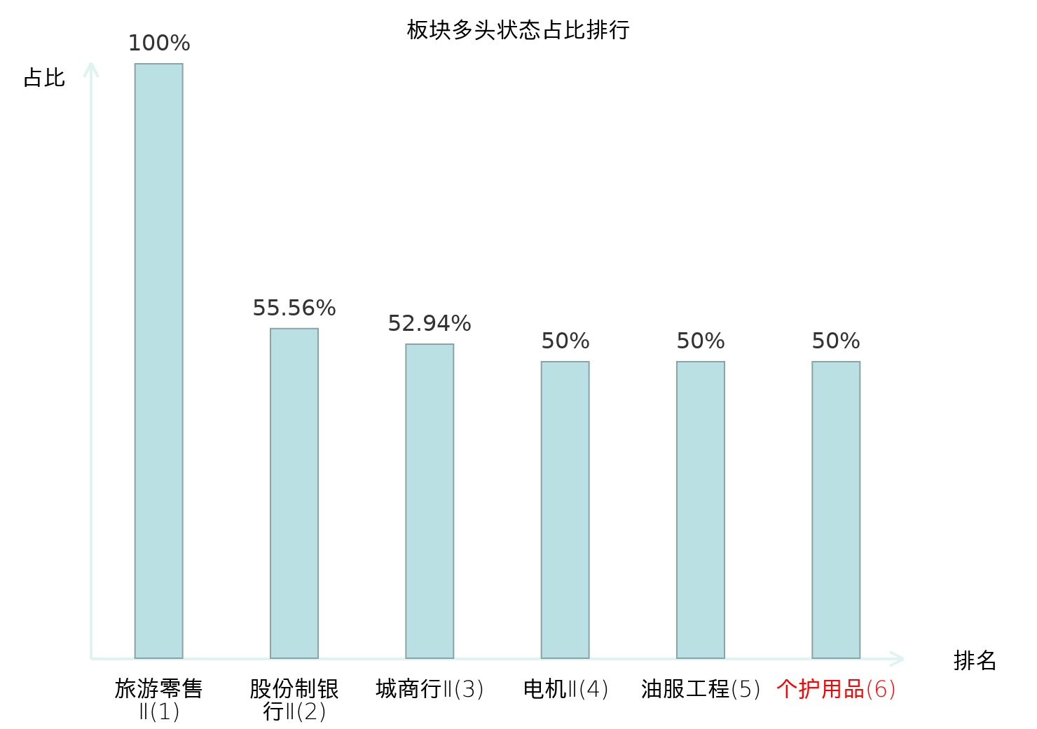 全市场所有行业板块中主力多头状态占比排名中,旅游零售Ⅱ板块位居第一。互联网电商板块名次提升最快,较昨日上升65位。