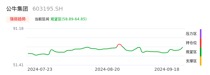 我们来看一下该股的九方特色指标强弱趋势的情况:公牛集团自08月26日从持仓区下穿到观望区。股价近期持续下跌后,短期出现止跌迹象。后续重点关注能否再次站上多空分界点:64.85元。如未能有效突破则可能进入新一轮空头行情。