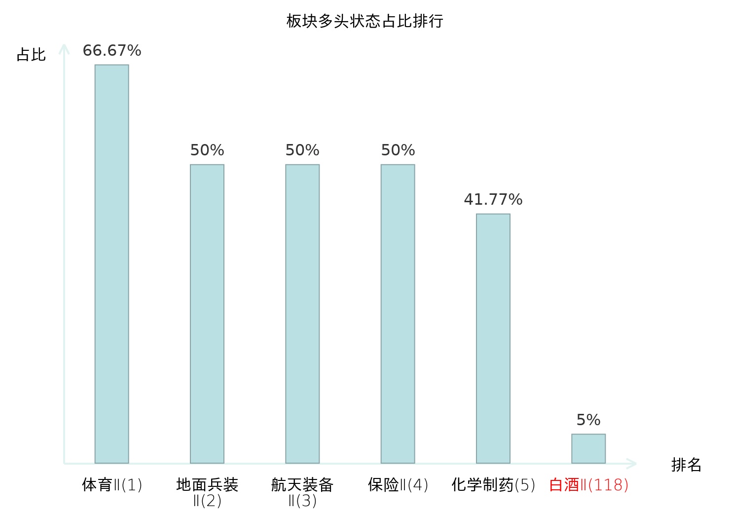 全市场所有行业板块中主力多头状态占比排名中,体育Ⅱ板块位居第一。普钢板块名次提升最快,较昨日上升98位。