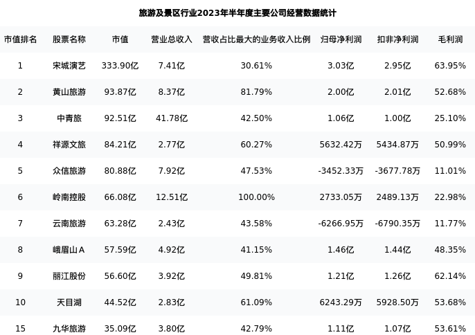 九华旅游最新报告期数据为半年度,下表汇总了旅游及景区行业内市值靠前的公司半年度主要经营数据