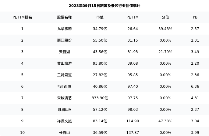 从估值角度看:九华旅游最新市盈率PETTM为26.64,在行业内排名1/20,处于39.56分位。