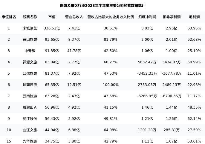 九华旅游最新报告期数据为半年度,下表汇总了旅游及景区行业内市值靠前的公司半年度主要经营数据