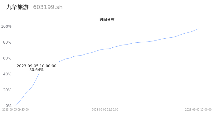603199九华旅游2023年09月05日成交6.40万手,成交金额2.04亿元,相较昨日放量2.94万手,换手率5.78%,成交清淡。