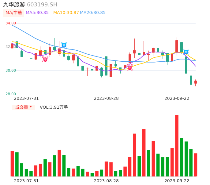 九华旅游近期出现日线级别熊点,且60分钟级别也处于熊点区间,股价处于偏弱行情,建议谨慎观望。