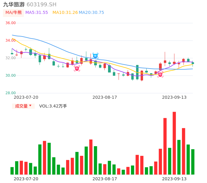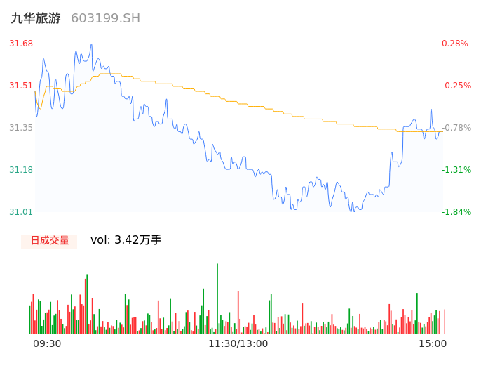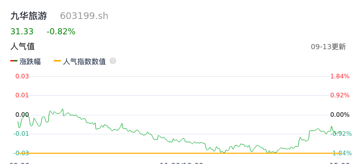 09月13日,九华旅游收报31.33,股价涨幅-0.82%,成交金额1.07亿元,换手率3.09%。