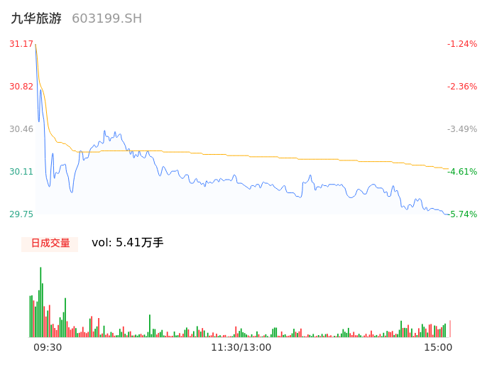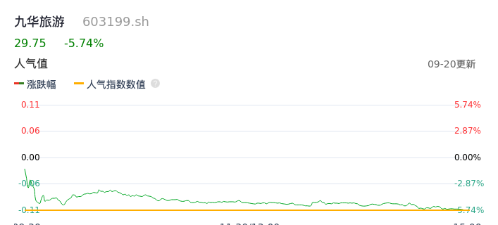 09月20日,九华旅游收报29.75,股价涨幅-5.74%,成交金额1.63亿元,换手率4.88%。