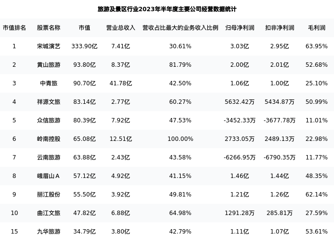 九华旅游最新报告期数据为半年度,下表汇总了旅游及景区行业内市值靠前的公司半年度主要经营数据