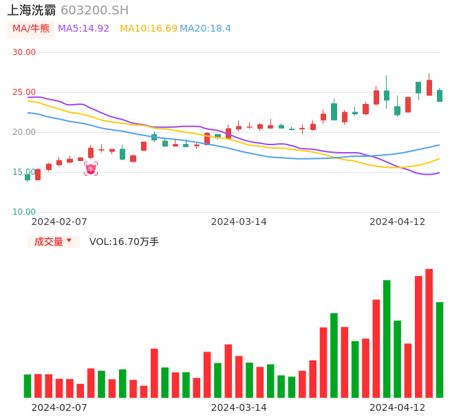 04月12日,上海洗霸收报23.84,股价涨幅-10.00%,成交金额4.09亿元,换手率9.52%。
