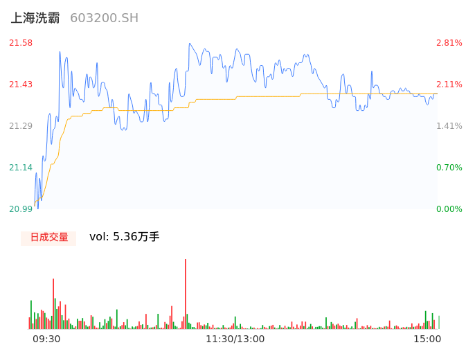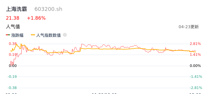04月23日,上海洗霸收报21.38,股价涨幅1.86%,成交金额1.15亿元,换手率3.05%。