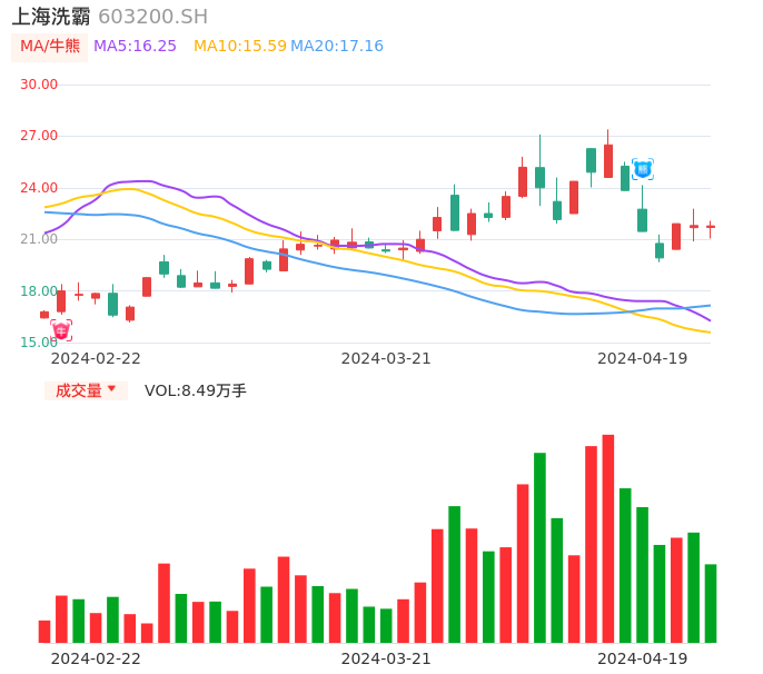 上海洗霸近期出现日线级别熊点,且60分钟级别也处于熊点区间,股价处于偏弱行情,建议谨慎观望。