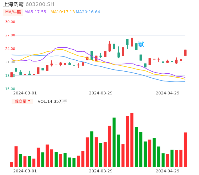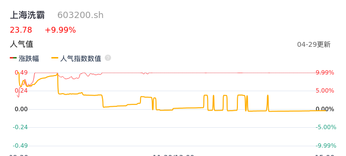 04月29日,上海洗霸收报23.78,股价涨幅9.99%,成交金额3.37亿元,换手率8.18%。