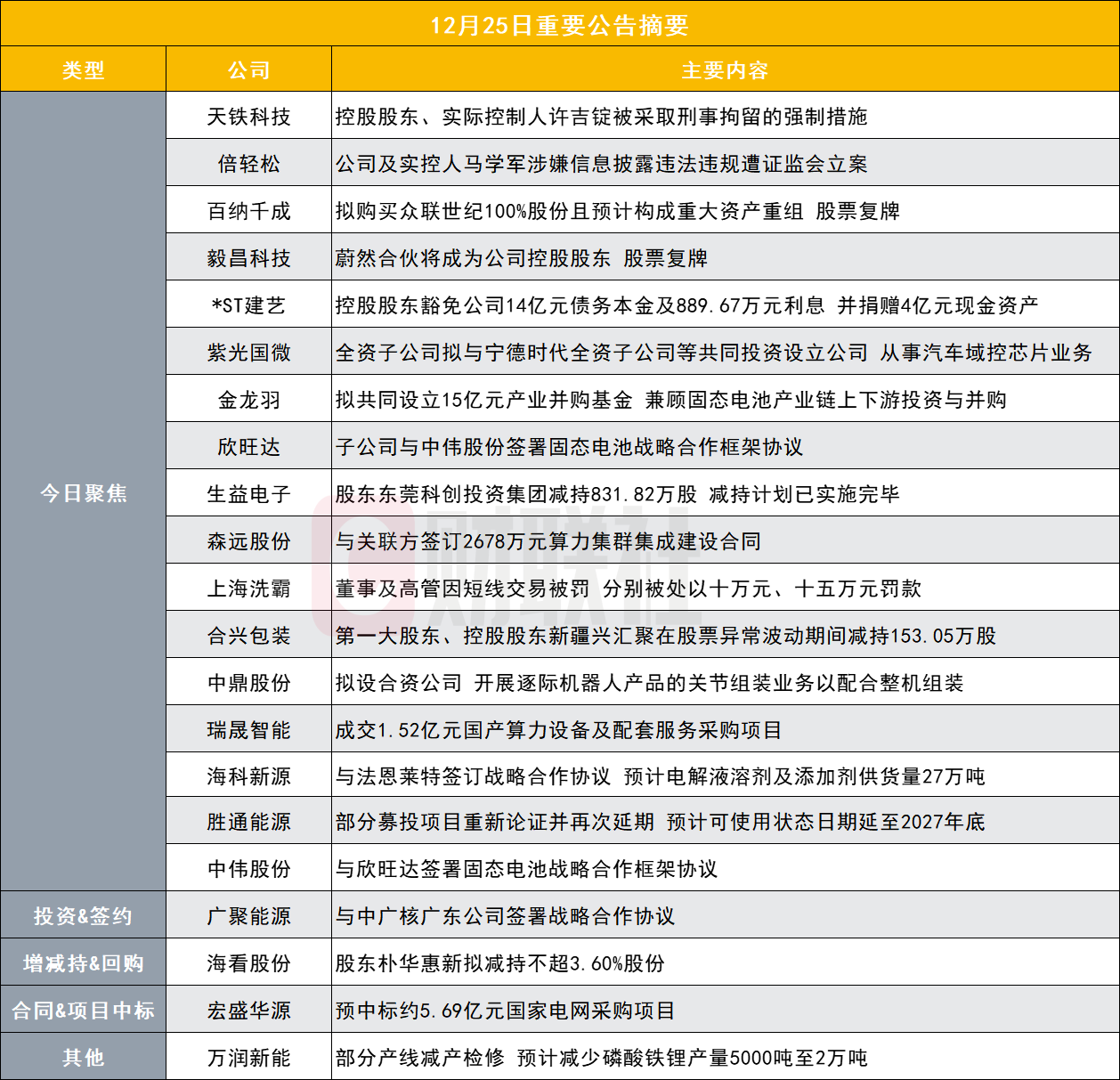 中伟股份(300919.SZ)公告称,公司与欣旺达动力科技股份有限公司于2025年12月25日签署《固态电池战略合作框架协议》,双方将围绕各自发展战略,在前驱体产品技术开发,产品供应、正极材料开发及全球产能布局等领域开展全方位的战略合作。本次合作旨在建立深层次的战略合作关系共同开发固态电池应用系列的新能源电池材料,推动固态电池应用系列新能源电池材料的产业化实施。本协议属于双方合作意愿和基本原则的框架性、意向性、初步的约定,尚存在不确定性。