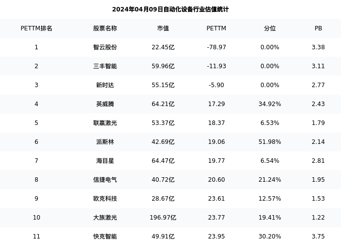 从估值角度看:快克智能最新市盈率PETTM为23.95,在行业内排名8/80,处于30.20分位。