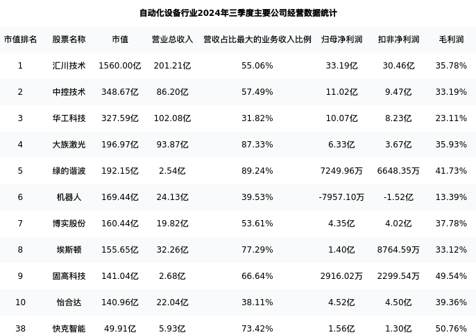 快克智能最新报告期数据为三季度,下表汇总了自动化设备行业内市值靠前的公司三季度主要经营数据