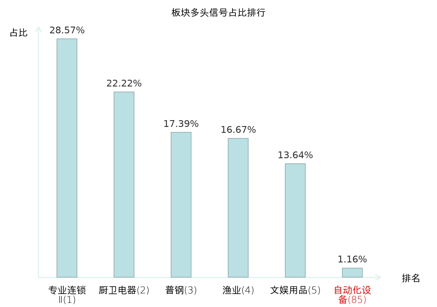 全市场所有行业板块中主力多头信号占比排名中,专业连锁Ⅱ板块位居第一。专业连锁Ⅱ板块名次提升最快,较昨日上升120位。