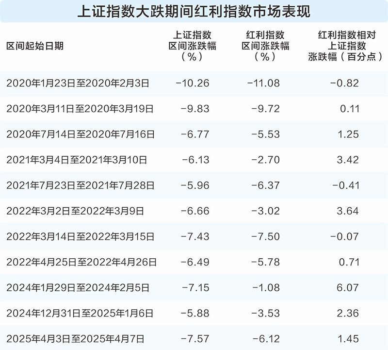 从历史数据来看,2020年以来的11次大跌(上证指数区间跌幅超5%)来看,红利指数有8次跑赢上证指数。比如2021年3月4日至10日,上证指数下跌6.13%,红利指数跌幅不足3%;2024年12月31日至2025年1月6日,上证指数下跌5.88%,红利指数跌3.53%。