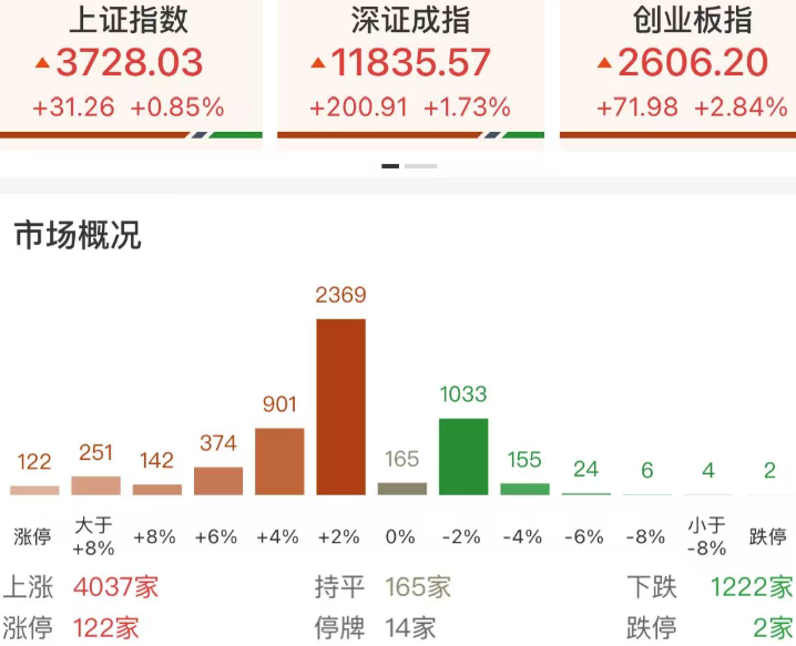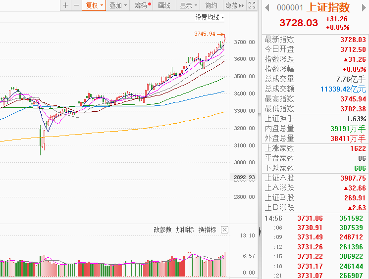 大盘分析及后市展望:今日,A股市场迎来高光时刻,沪指强势突破3731点高位,创十年新高,深成指与创业板指也不甘示弱,纷纷突破去年“924”高位,再度刷新年内纪录。指数在触及3745点后虽有小幅跳水回落,但市场的火热氛围已然点燃。AI概念炒作蔓延,液冷服务器概念涨超5%,中国AI50、CPO概念、AI语料、AIPC涨超3.5%。中际旭创、新易盛、同花顺、指南针等创业板权重股大幅拉升,带动创业板涨超3%。上证指数创出近十年新高,A股总市值破100万亿。