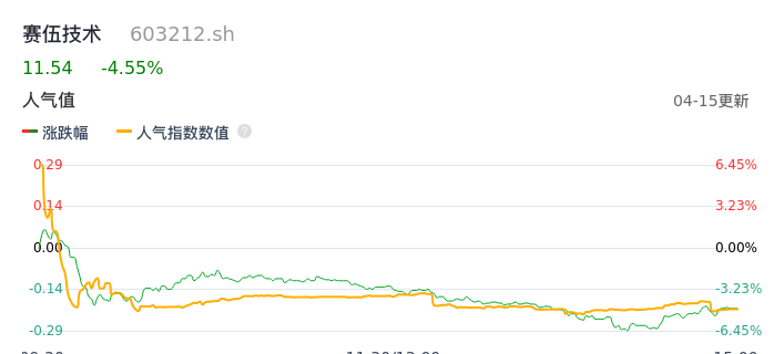 04月15日,赛伍技术收报11.54,股价涨幅-4.55%,成交金额1.45亿元,换手率2.83%。