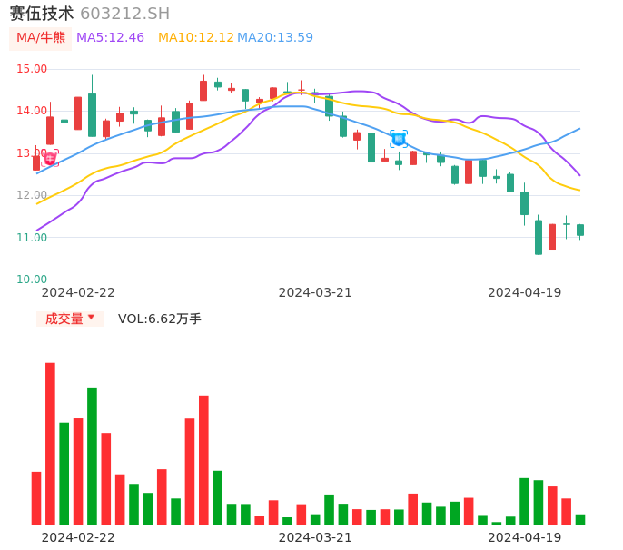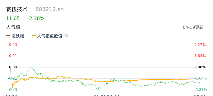 04月19日,赛伍技术收报11.05,股价涨幅-2.30%,成交金额7348.14万元,换手率1.51%。