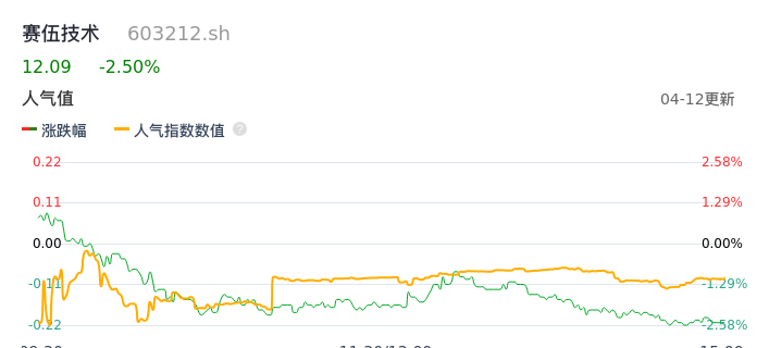 04月12日,赛伍技术收报12.09,股价涨幅-2.50%,成交金额7646.58万元,换手率1.43%。