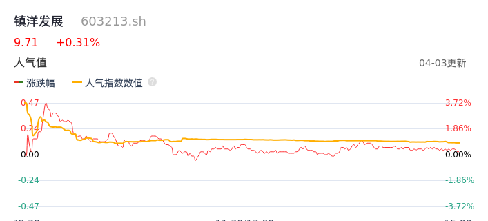 04月03日,镇洋发展收报9.71,股价涨幅0.31%,成交金额6125.82万元,换手率4.01%。