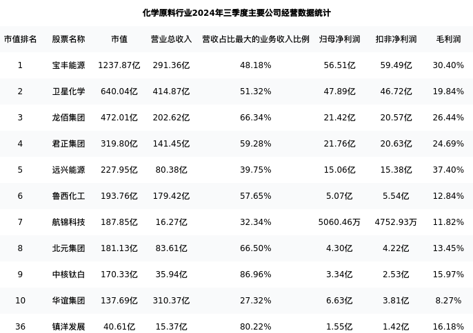 镇洋发展最新报告期数据为三季度,下表汇总了化学原料行业内市值靠前的公司三季度主要经营数据